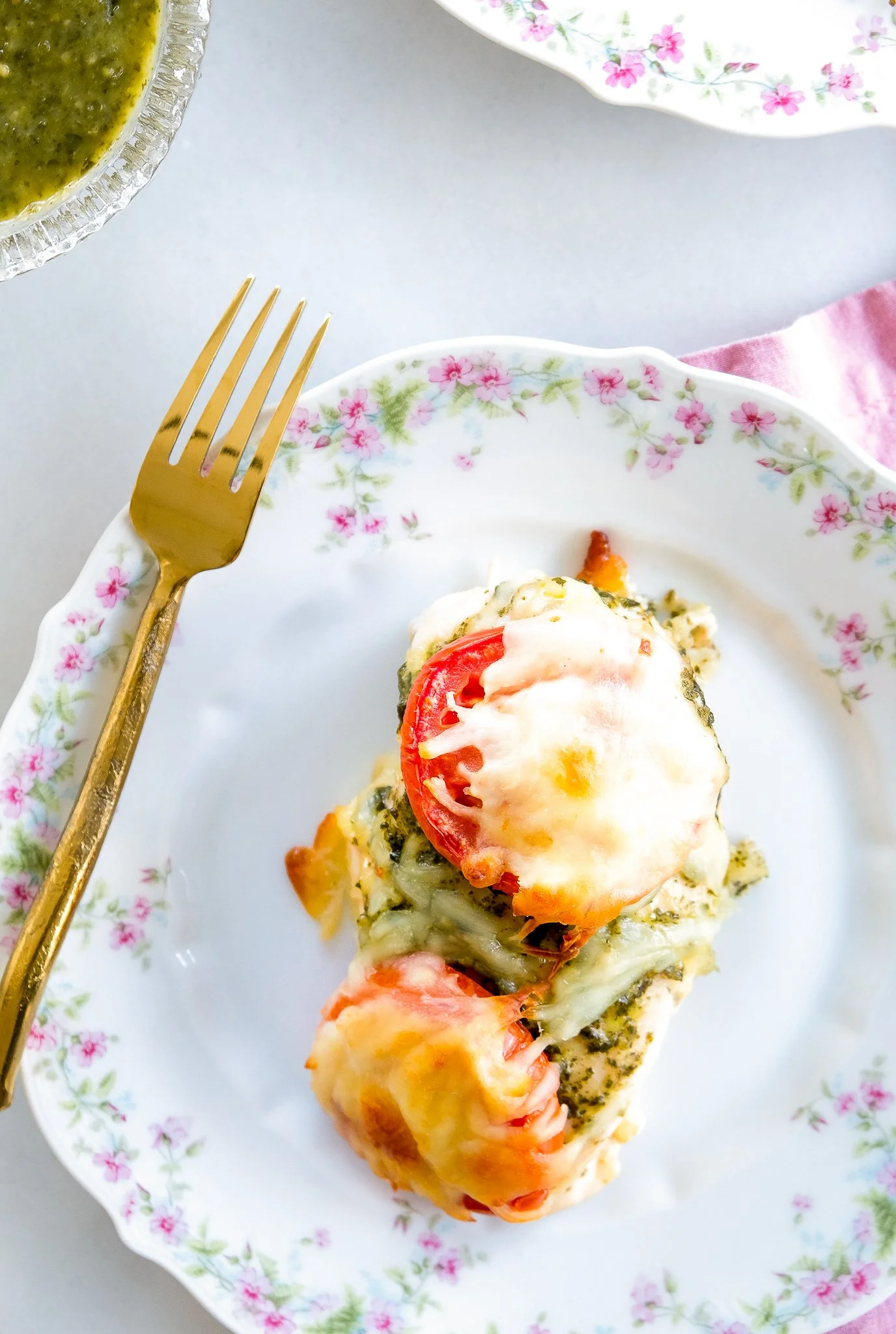 Okay, back to this delicious Baked Caprese Chicken! :) Minus the olive oil, salt & pepper, this recipe only requires FOUR ingredients! Yep, you heard that right -- chicken breasts, fresh pesto (found in the refrigerated section at the grocery store), tomatoes, and shredded mozzarella cheese!