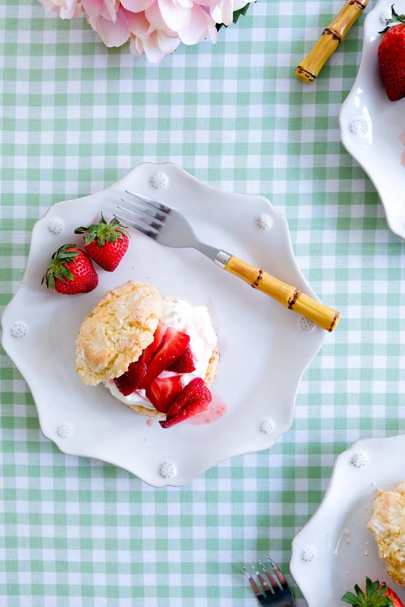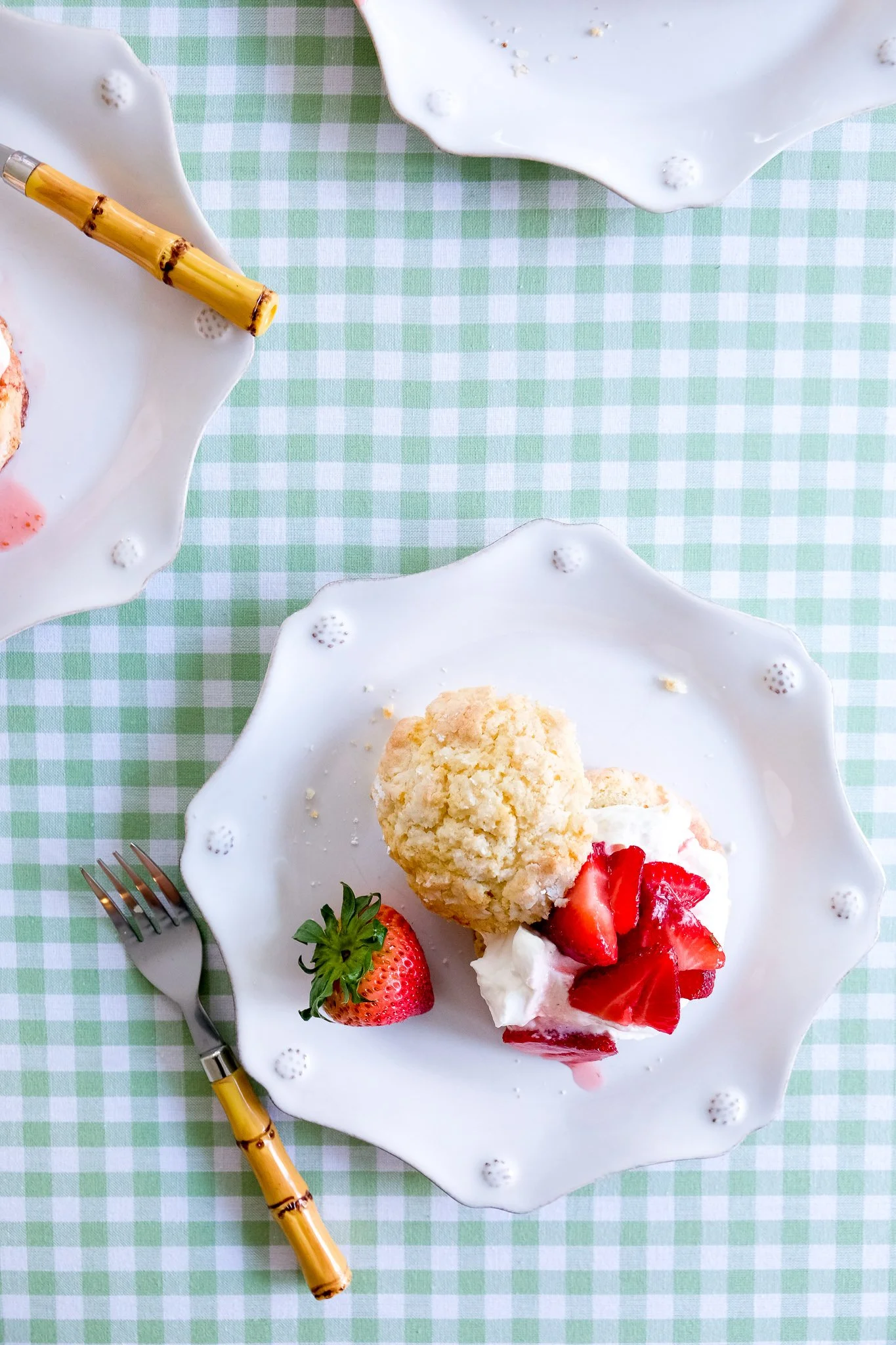 I love that I can make this dessert completely ahead of time! Y’all know that I am all about making everything in advance when entertaining. You can assemble the shortcakes yourself OR make a little dessert buffet and let your guests build their own! These Juliska Berry & Thread dessert plates with the scalloped edges are the perfect backdrop to make this dessert POP!