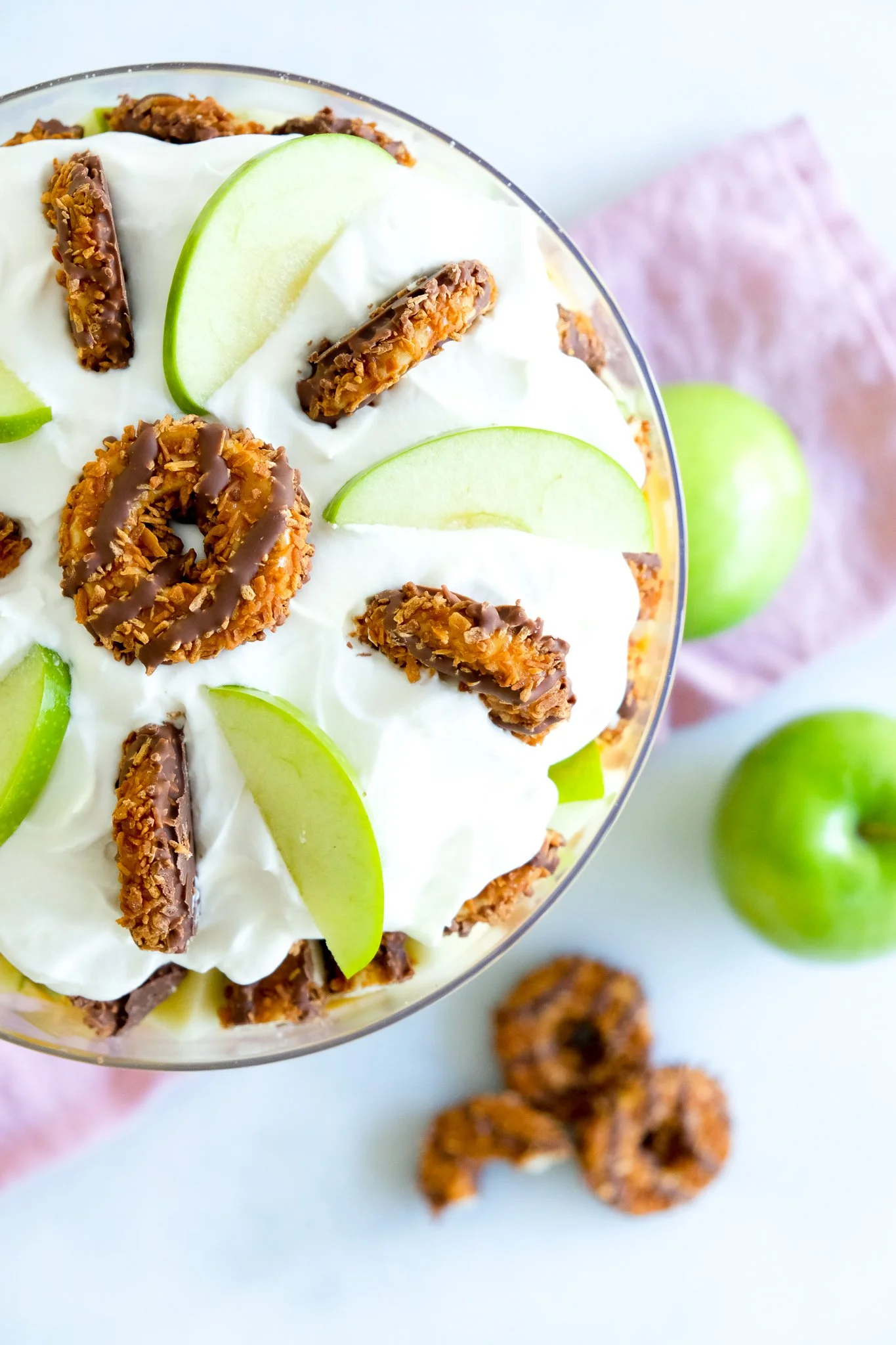 Just before serving, top with remaining freshly whipped cream, apple slices & Samoa cookies.