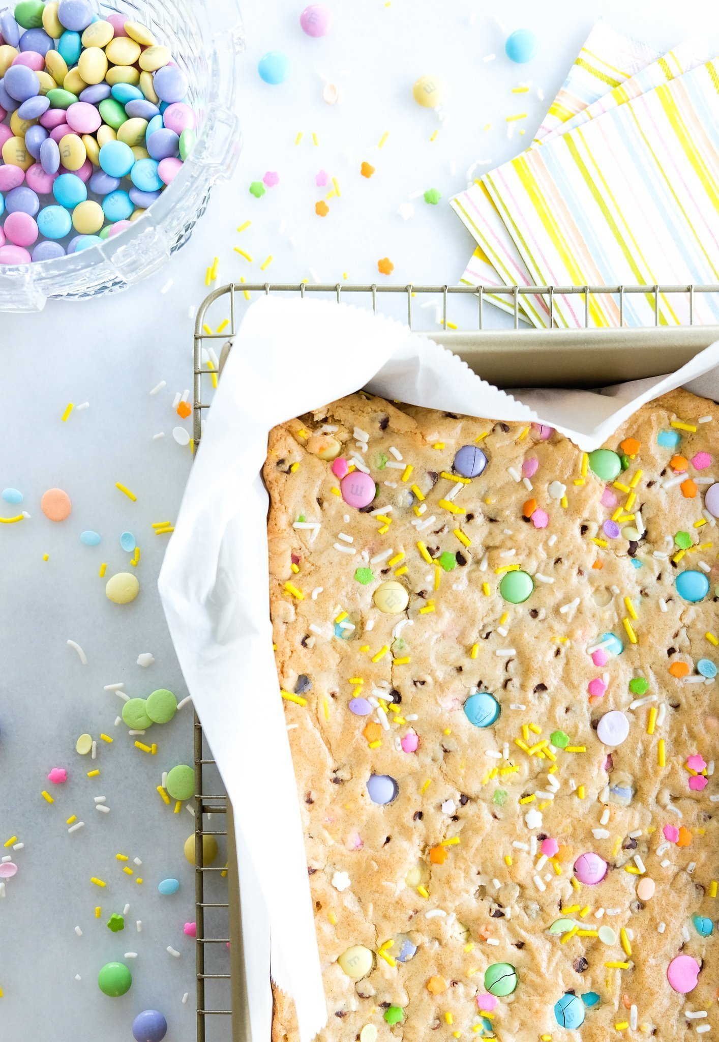 I'm sure you recognize these blondies from Valentine's Day! I just swapped out regular M&Ms for dark chocolate Easter M&M's and more colorful sprinkles! One of the things I love the most about this recipe is how versatile it is! If you don't have mini chocolate chips you can most definitely use regular ones. :)