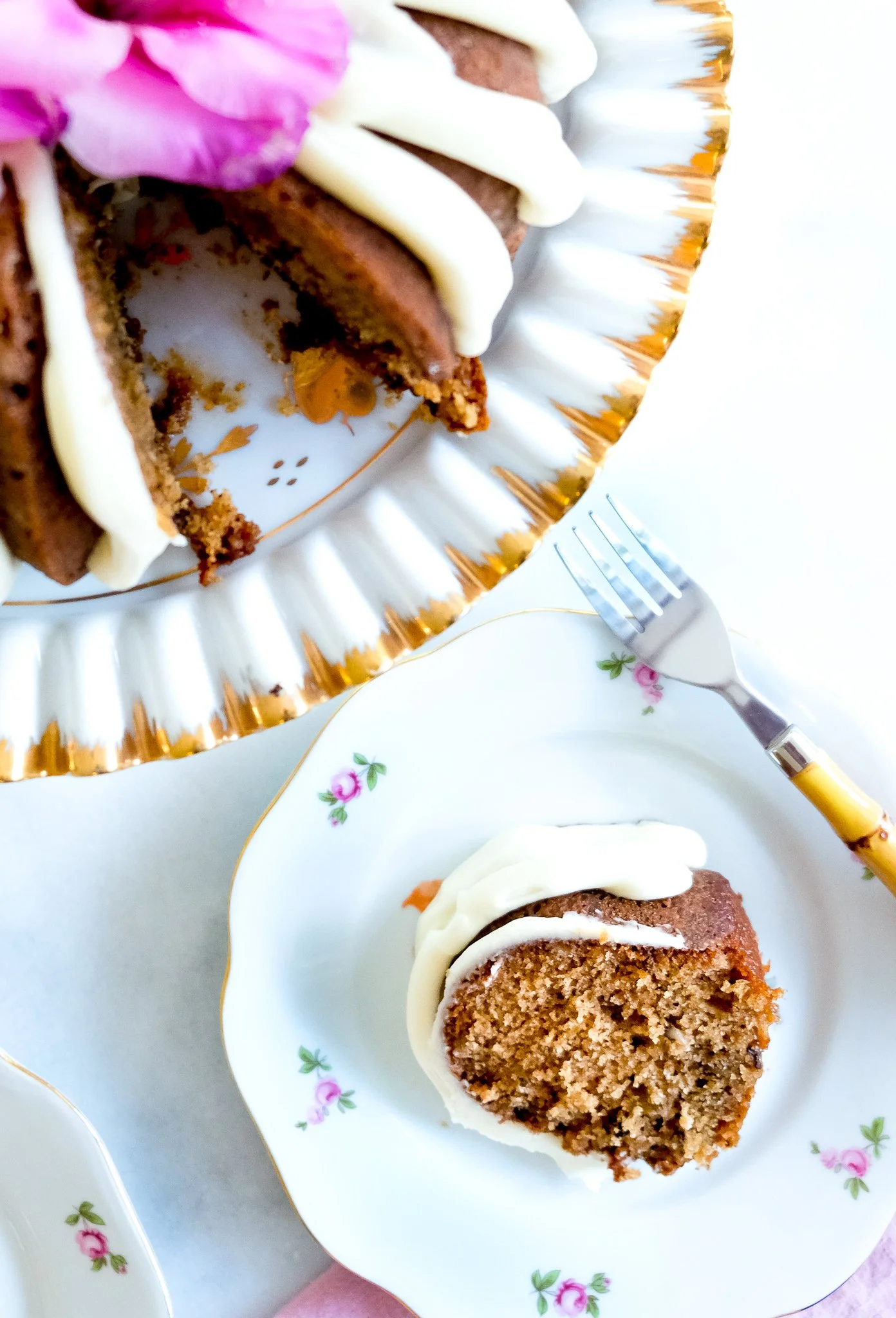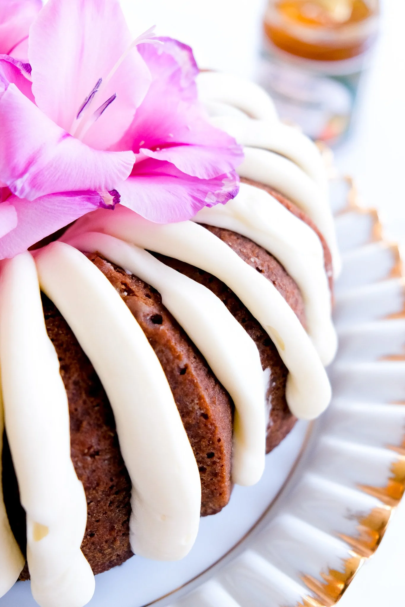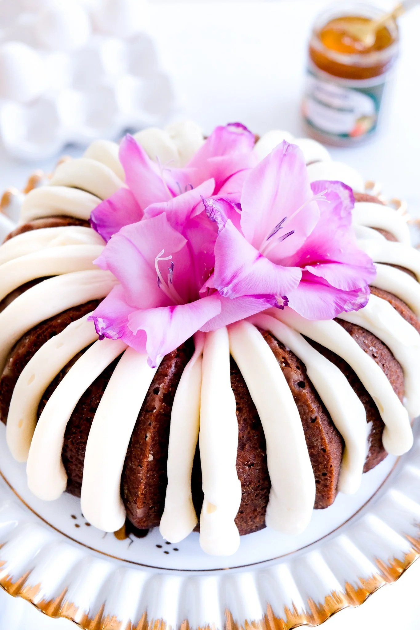Frosting this bundt cake is BEYOND simple!! I adopted the frosting technique from the famous Nothing Bundt Cakes! I watched this YouTube video to see how they exactly do it! I used a gallon size zip lock back and trimmed off the bottom corner. The key is to start frosting from the bottom of the cake towards the center. Then you just want to make you have an offset spatula to smooth out the center. Fresh flowers in the center are a major bonus — just be sure no one actually eats them! 😉