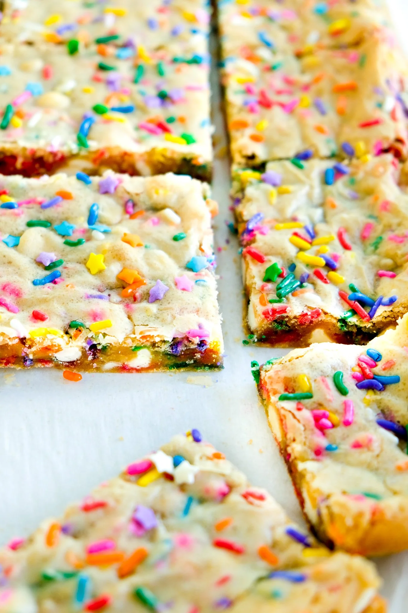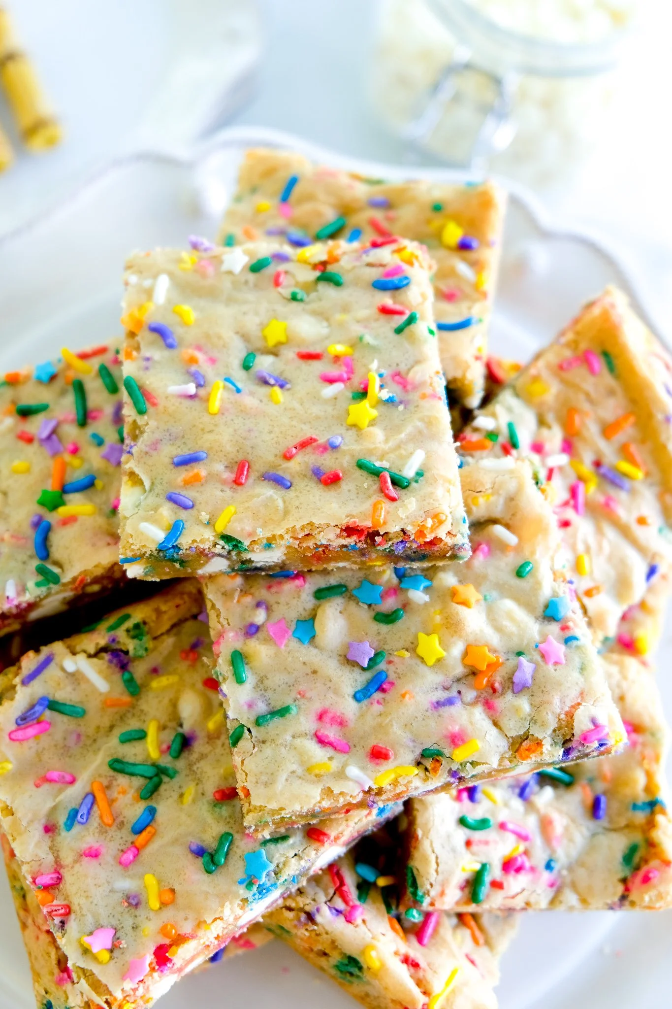Funfetti Blondies -- enough said. ;) I mean I didn’t think the original blondie recipe could be surpassed BUT when you add “funfetti” to any recipe it’s almost like cheating lol. I thought it would be super fitting to post these celebratory blondies because I have some EXCITING NEWS I want to share with y’all! 🎉
