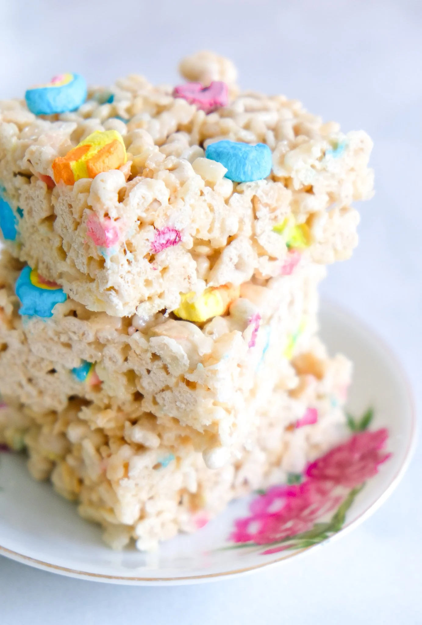 When coming up with this recipe -- I asked myself… “How can I make Rice Krispie Treats that are super unique & unforgettable?” Well, you guessed it -- Lucky Charms did the trick y’all! There is just something that is SO great about the crunch of the frosted cereal & colorful marshmallows combined with the crispy rice cereal! The combination is truly magical -- adults & kids will go crazyyy for these!