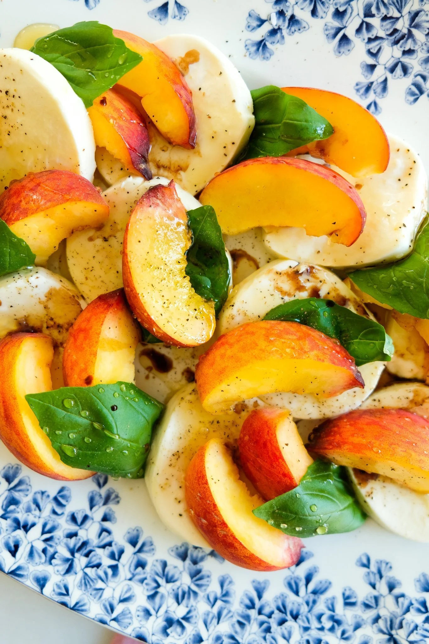 As you may know, a traditional Caprese salad is made with tomatoes. While it is equally as good, I love this fresh twist with peaches in the summer! The sweetness of the peaches and honey contrasted with the balsamic vinegar, coarse salt, pepper, and mozzarella is absolute PERFECTION!