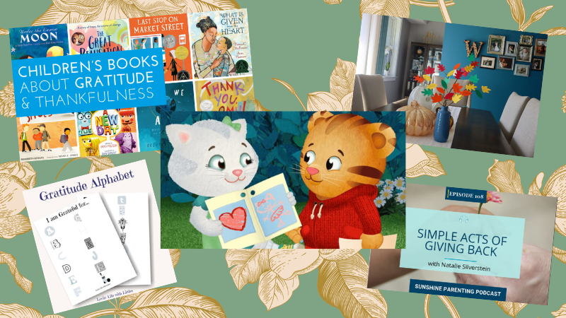 This doesn’t require lots of money or time and can be repeated in so many ways. You can give someone a meal, physically give something away (clothing or toys), or volunteer your time. There are so many ways to give that, in turn, promote thankfulness for what you do have. I love this podcast from Sunshine Parenting interviewing Natalie Silverstein about her book, Simple Acts: The Busy Family’s Guide to Giving Back.