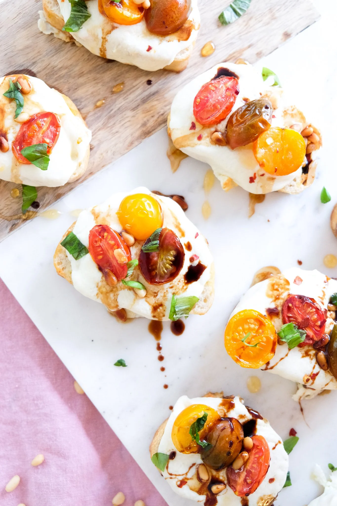 Since there are so many elements to the crostini, I like to keep things simple and serve them on a marble board cheese board. One of my sweet friends gave me this Marble & Wood Cheese Board from Williams Sonoma and I have gotten so much use out of it!