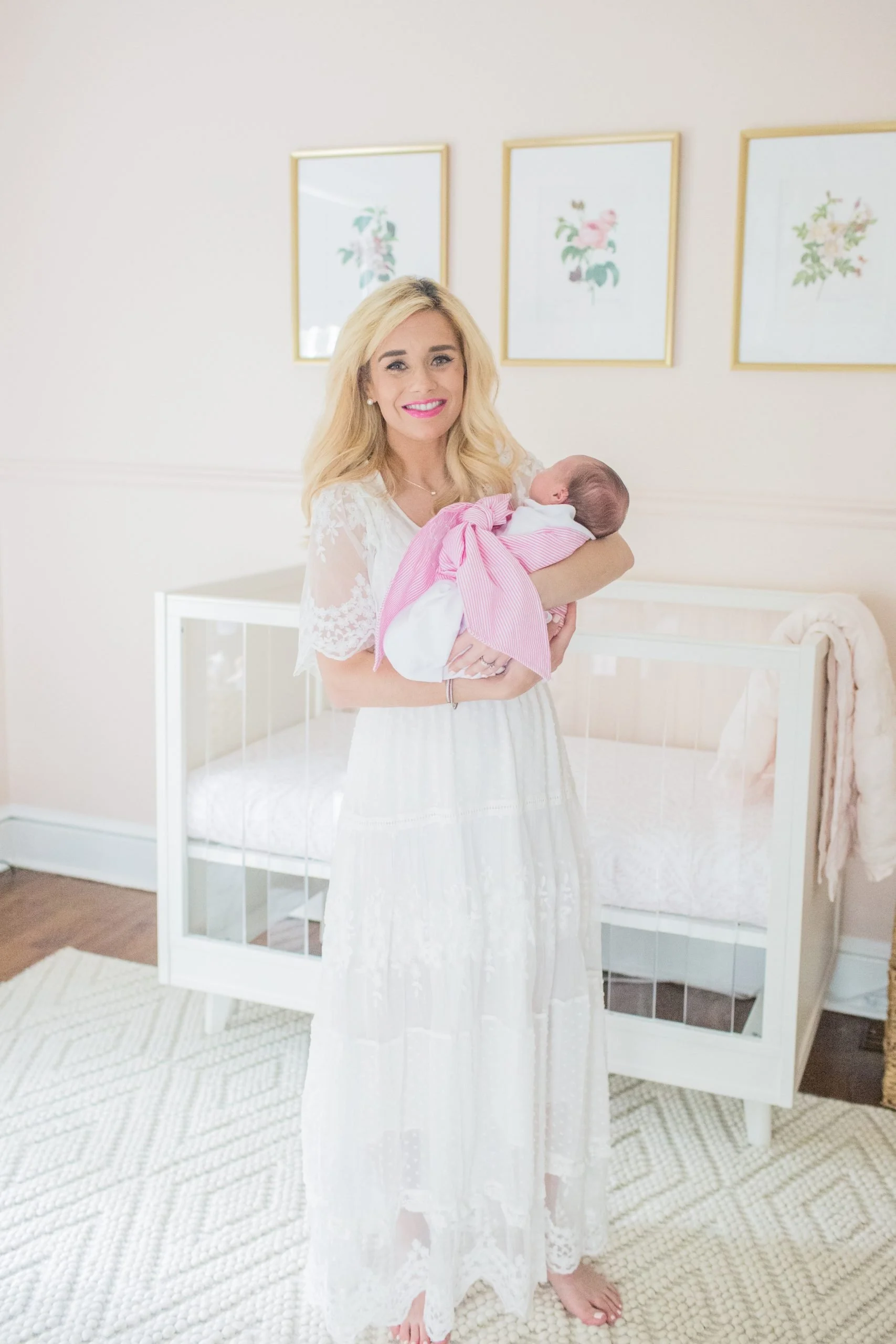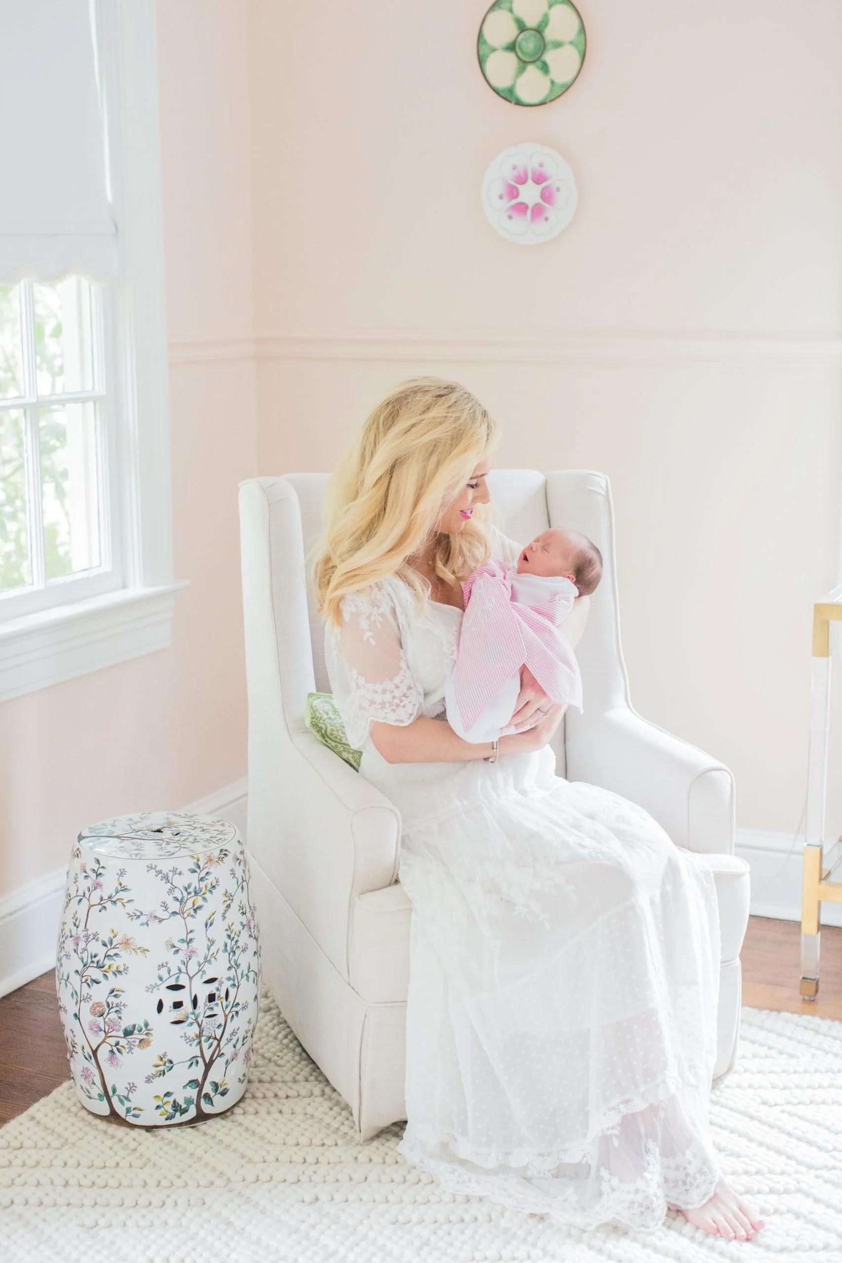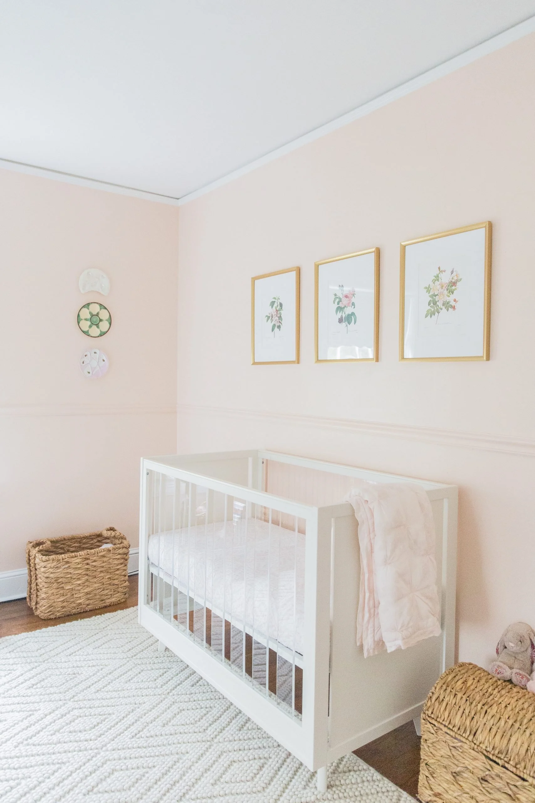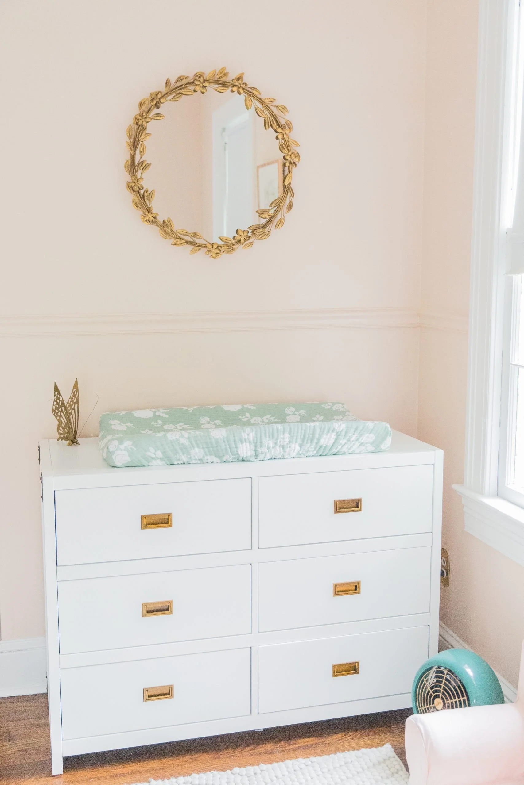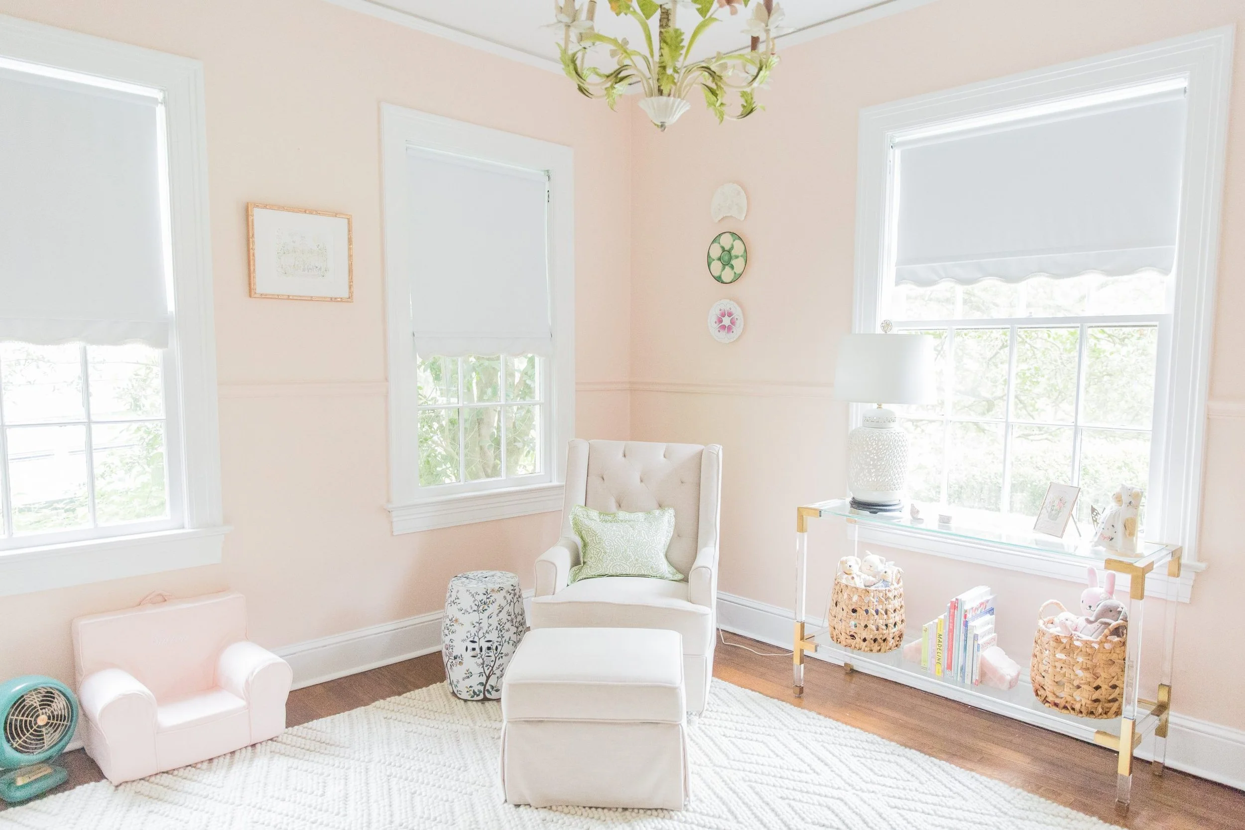 I'm so excited to share Sutton's nursery with y'all! Putting together this room was a dream come true and something I had dreamed about for years. The theme of it started with the Italian tole palm tree chandelier that I actually bought at an antique store back in 2015. From there her room took on a floral/botanical theme. Little did I know that her nickname would be "Rosebud" -- Jaxon's mom gave her that name because of her little rosebud lips. :) The walls are painted Farrow & Ball Pink Ground and it turned out to be the perfect soft blush color. I hope y'all enjoy -- everything is linked at the very bottom of the post.