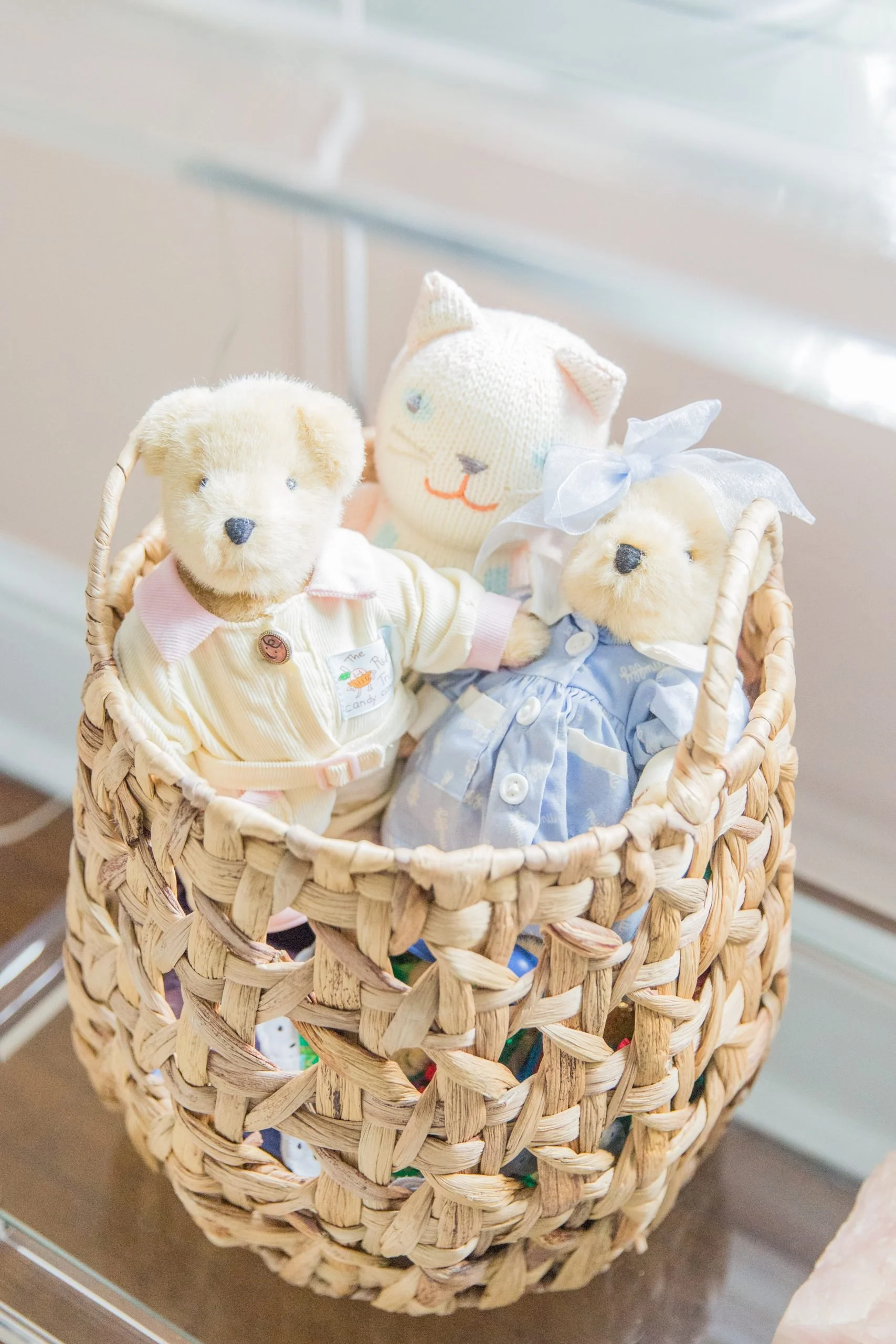 Garden stool, antique chandelier, and basket.